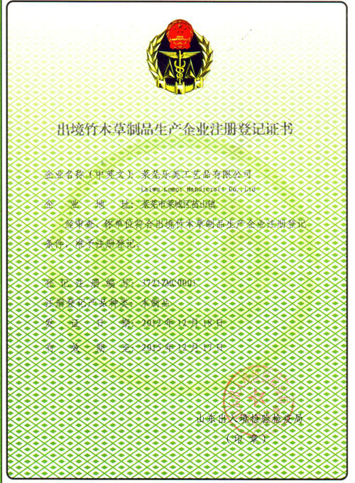 出境竹木草制品生產(chǎn)企業(yè)注冊登記證